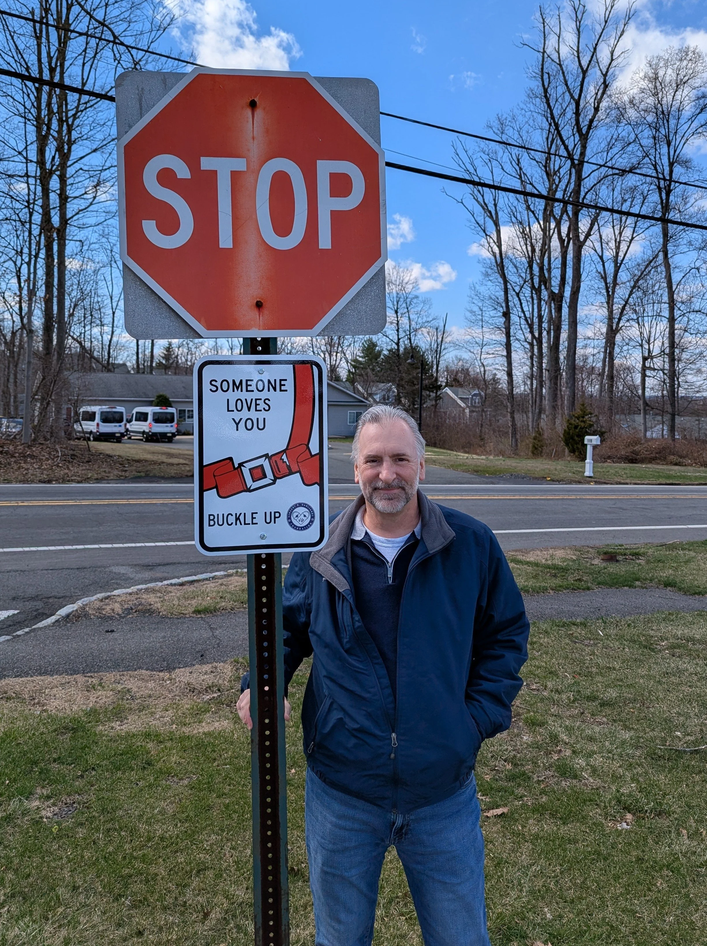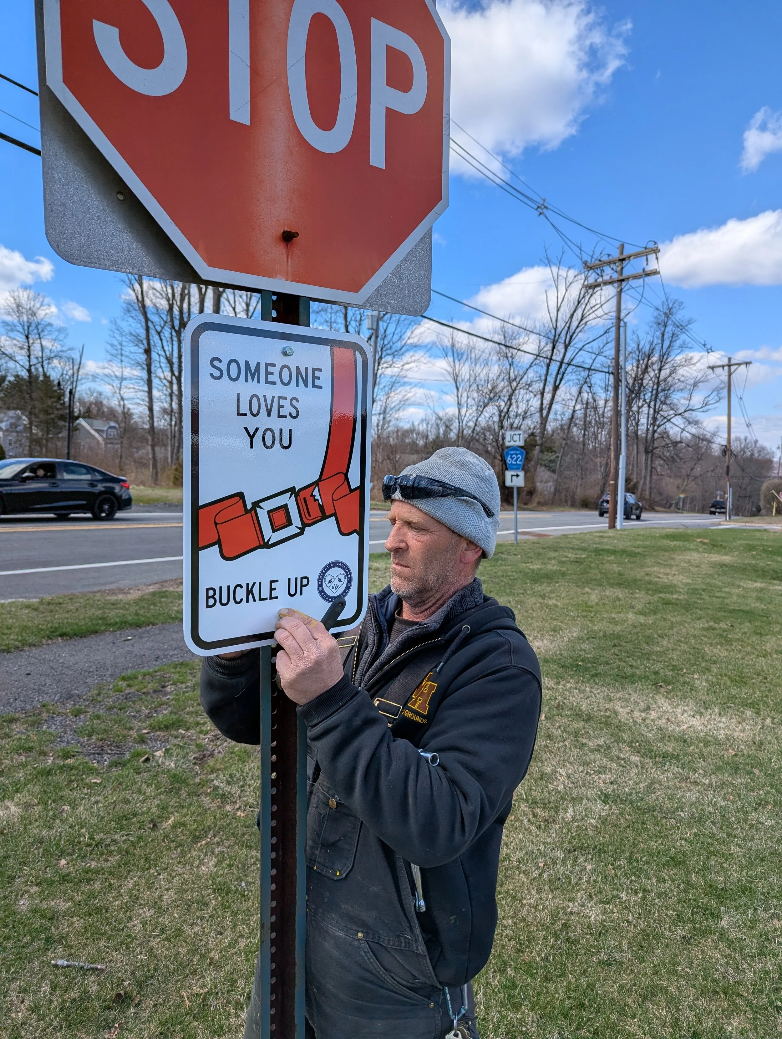 Vincent’s uncle, Anthony Gagliardi installing a seat belt reminder sign at Watchung Regional High School